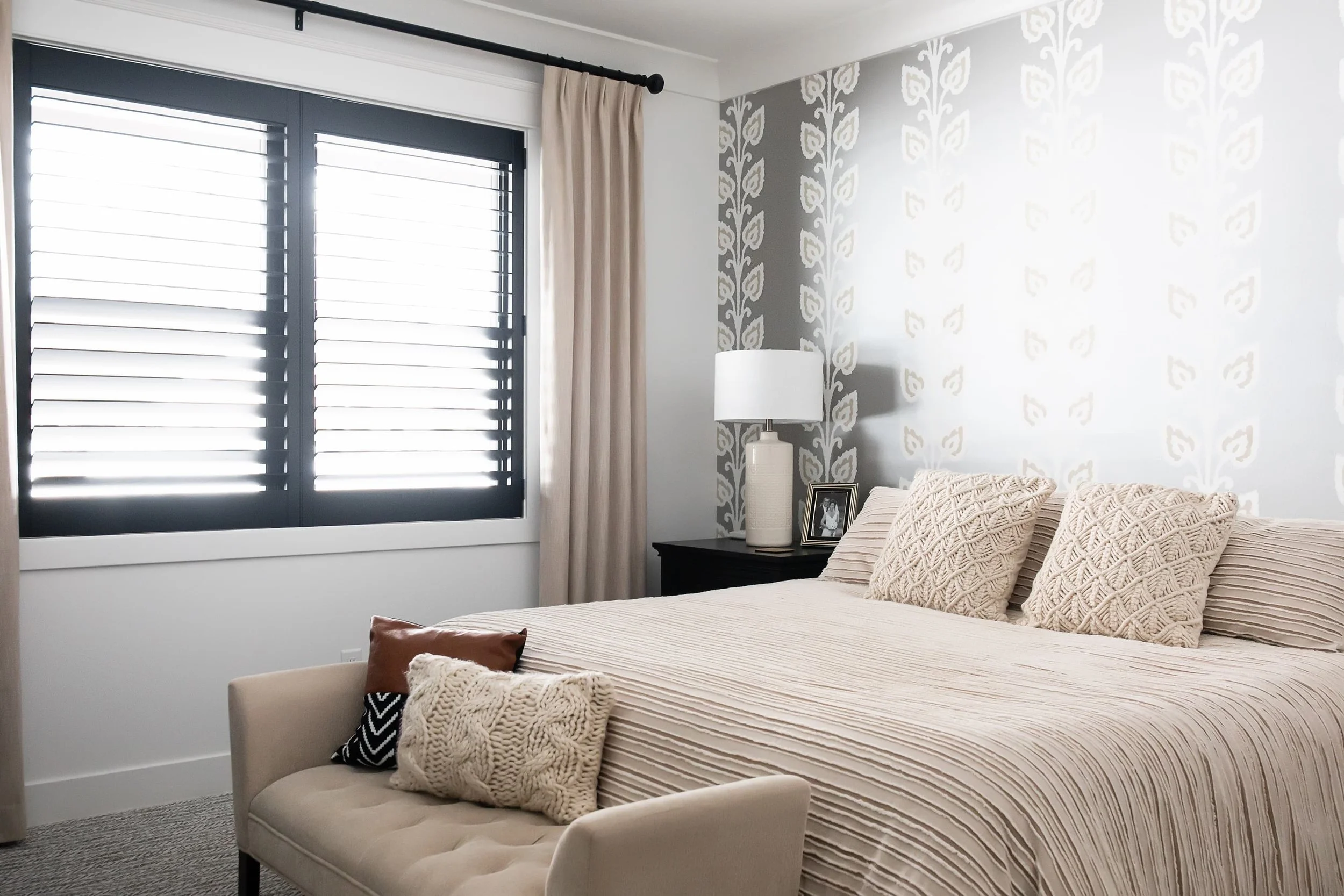 A refined update brings contrast and softness to this bedroom retreat through tailored window treatments and layered textures. Black accents add structure, while linen drapery softens the light, creating a balanced, inviting feel.