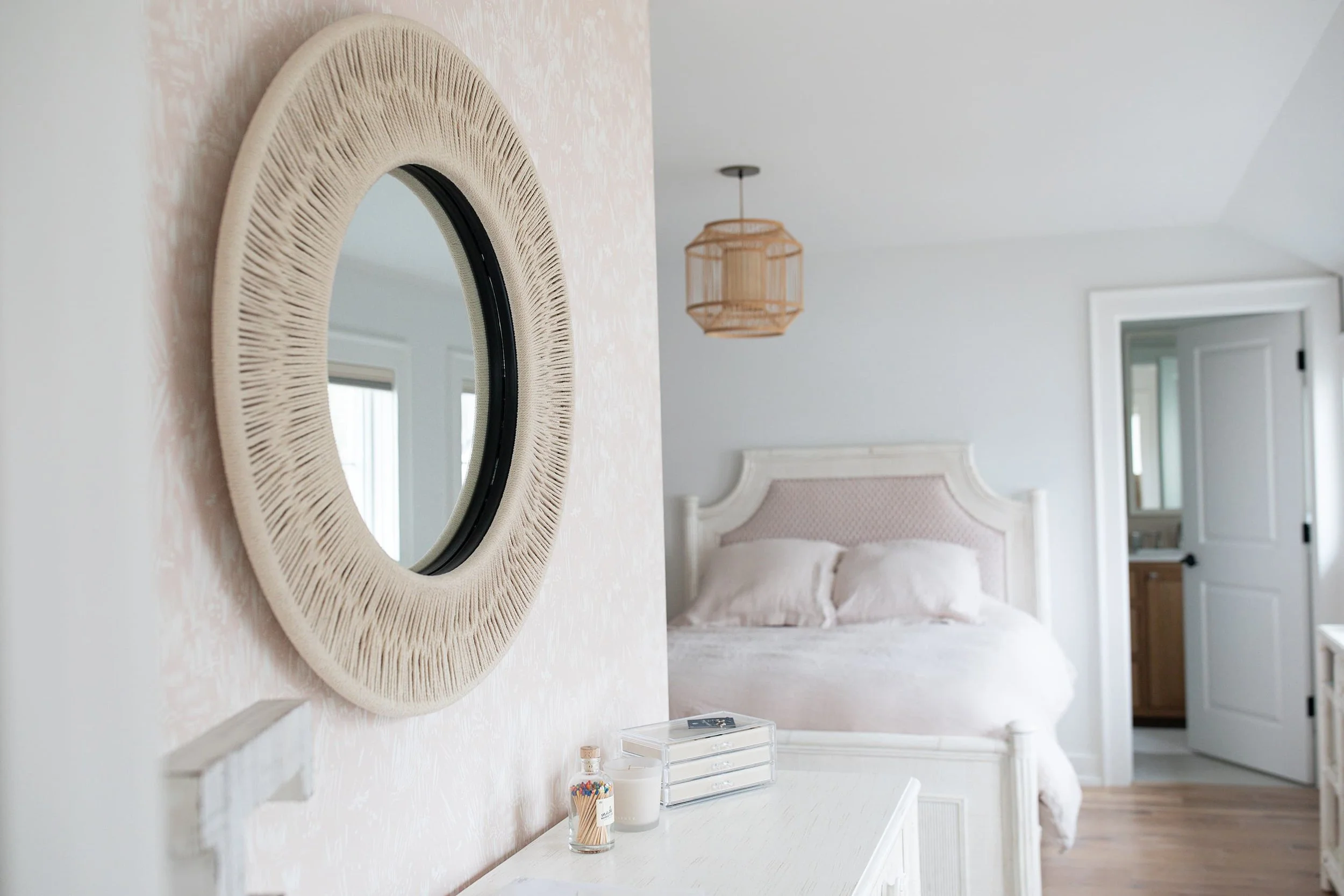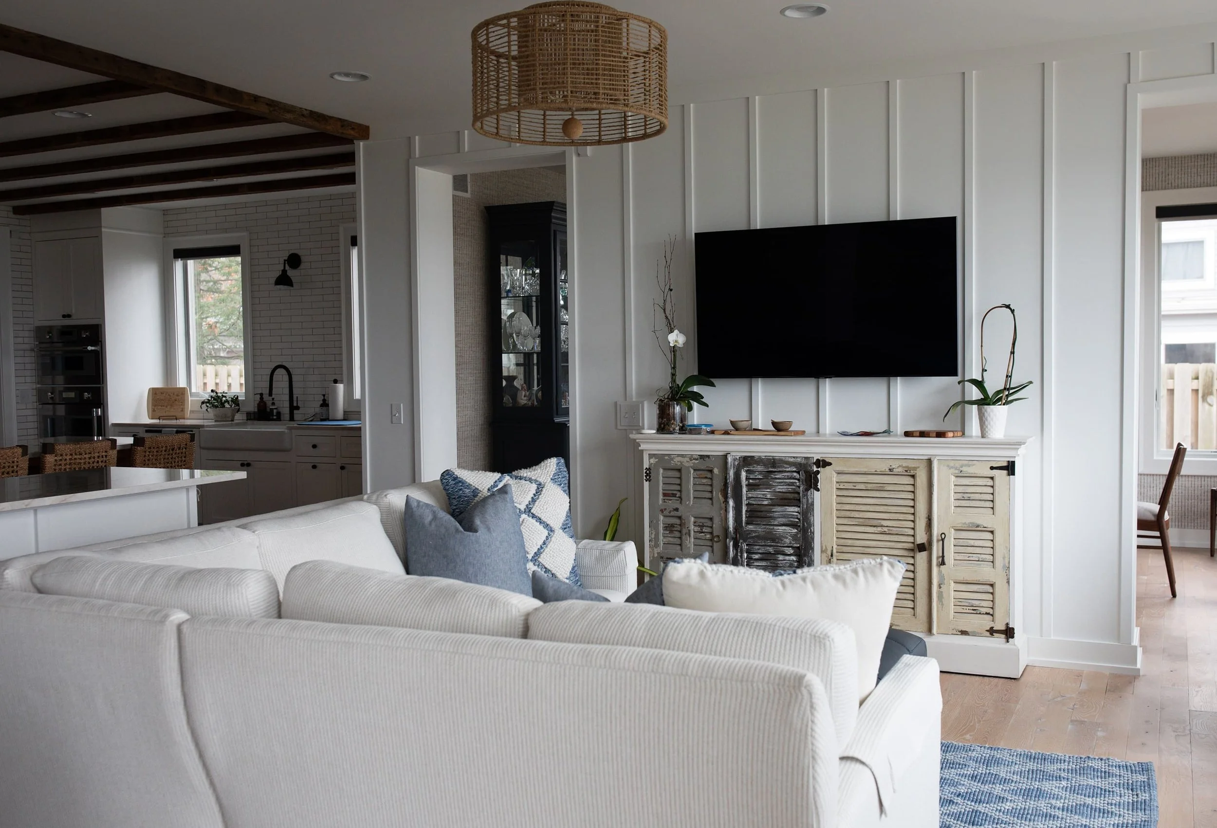 Clean lines and a soft palette define this living space, where natural textures and subtle blue accents add depth. A woven pendant and tailored furnishings bring warmth and structure to the room.